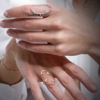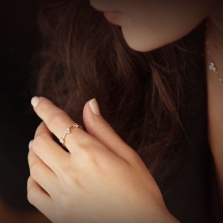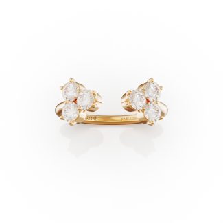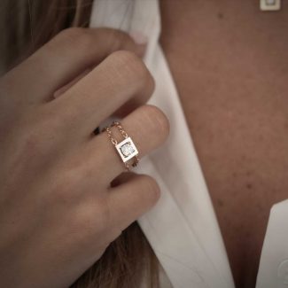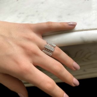 Bague 5 Rangs Diamant – Collection Nëve La vision superbe de la Collection Nëve, née de l’inspiration de la Créatrice Morganne Bello, reproduit le scintillement de la lumière à travers les feuillages, sur la mer ou la neige. D’innombrables éclats de lumière se mouvant en toute liberté, jouent avec notre regard. La Bague Nëve, composée de chaînes mobiles serties de Diamants, capture à merveille la lumière pour faire étinceler votre doigt. Motif composé de 5 chaînes serties de 9 Diamants naturels FSI (0,81 carats) A l’arrière du doigt, un demi-corps rigide vient tenir les chaînes et facilite grandement le passage de la bague à votre doigt Chaîne, serti et demi-corps en or 18K (750‰) déclinés en Or Blanc, Jaune et Rose Tailles de Ø48 à Ø60 (voir le Guide d’Achat plus bas) Bague fabriquée dans nos ateliers français Bague disponible sous 24h à 72h maximum (jours ouvrés) selon stock Cette bague peut être réalisée pour un autre tour de doigt ou une autre qualité de diamant. Contactez la boutique LAYONE pour toute demande spécifique : 01 42 36 05 18.