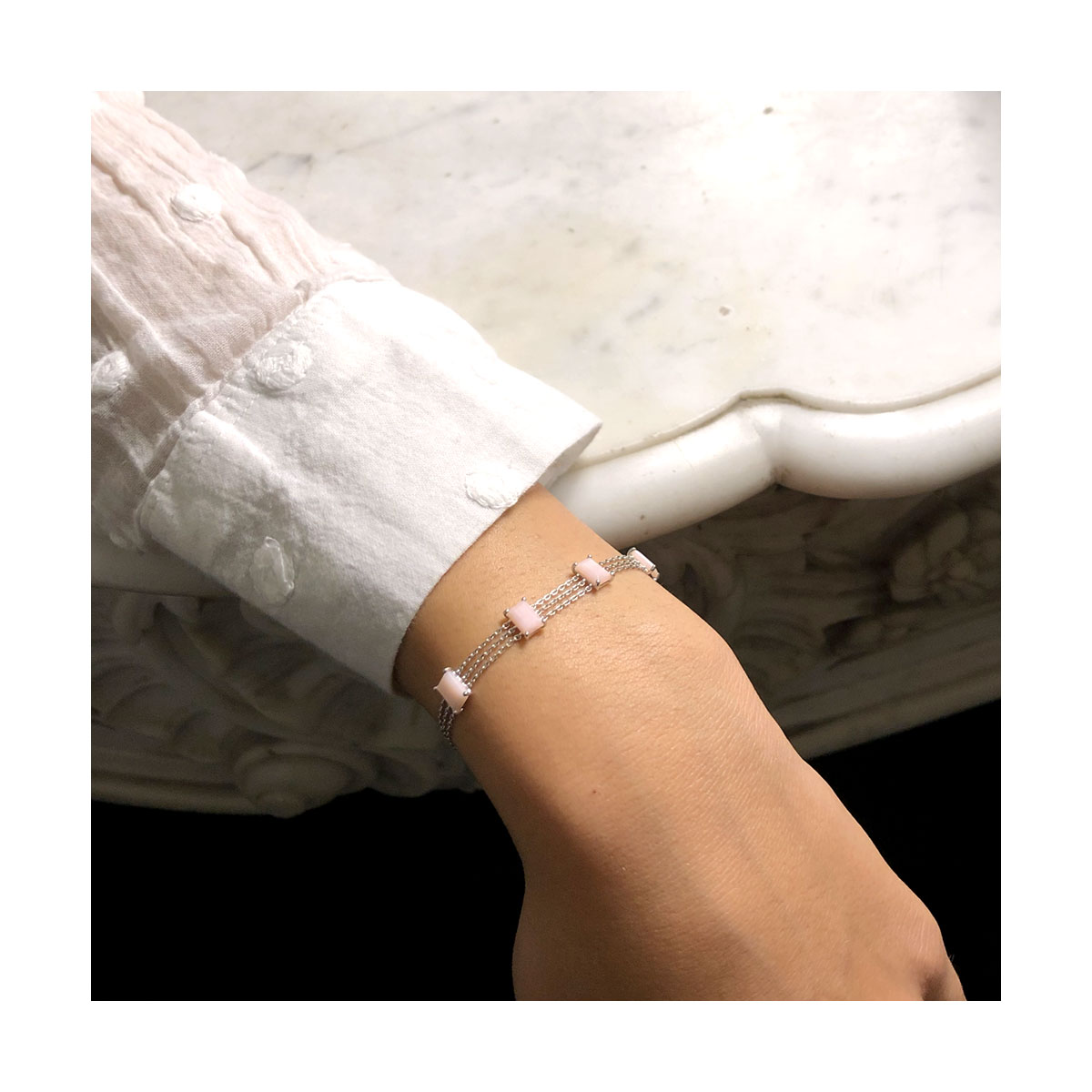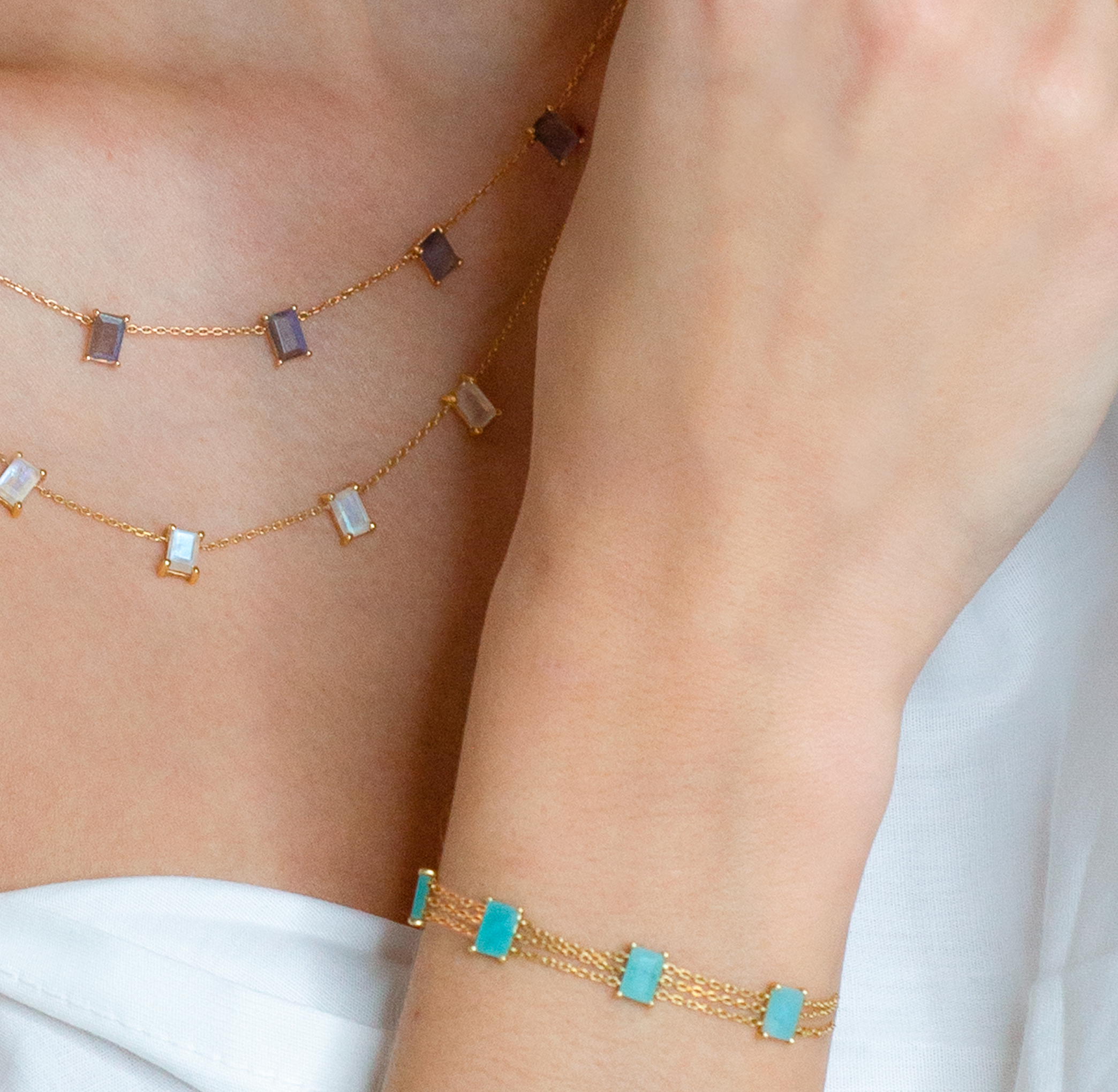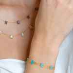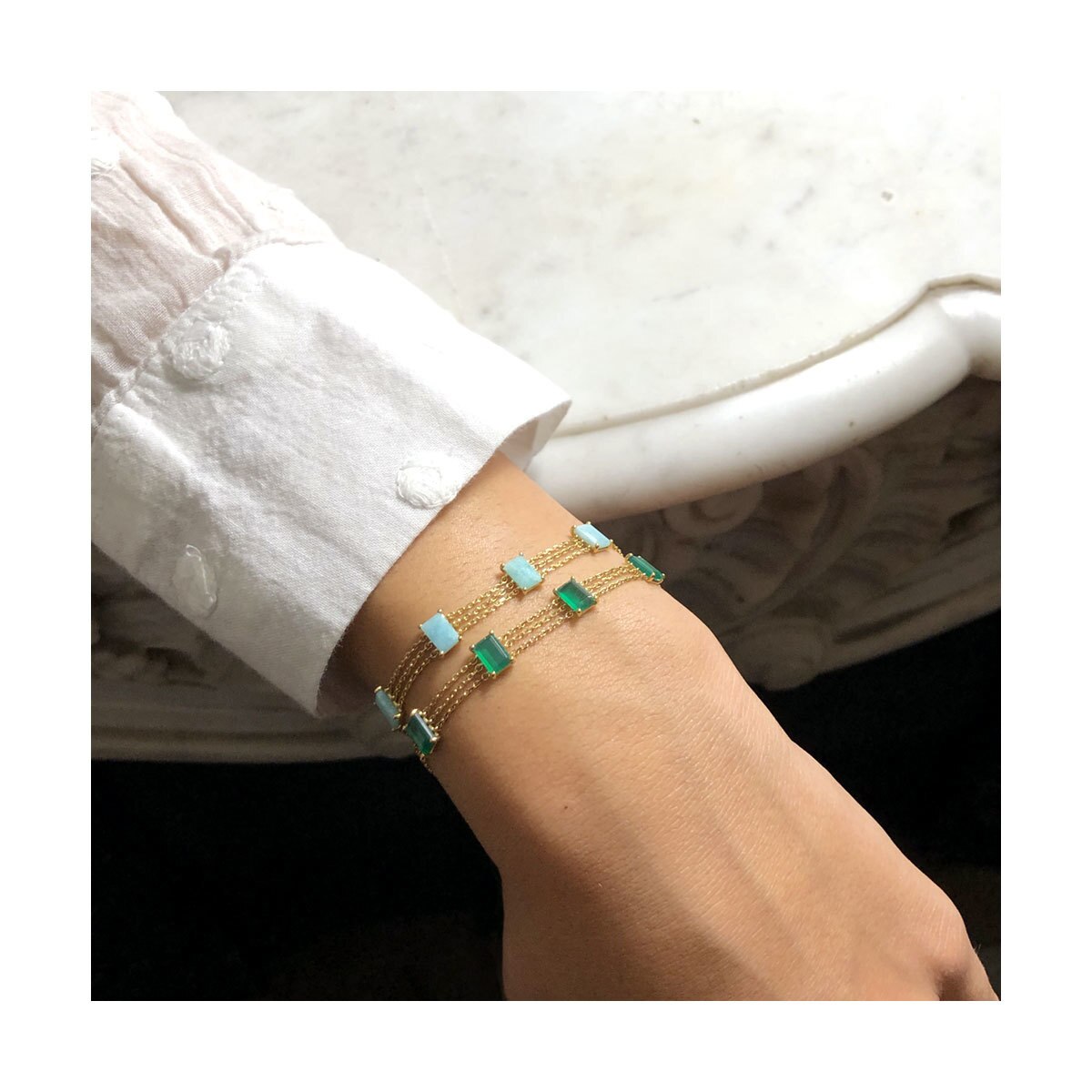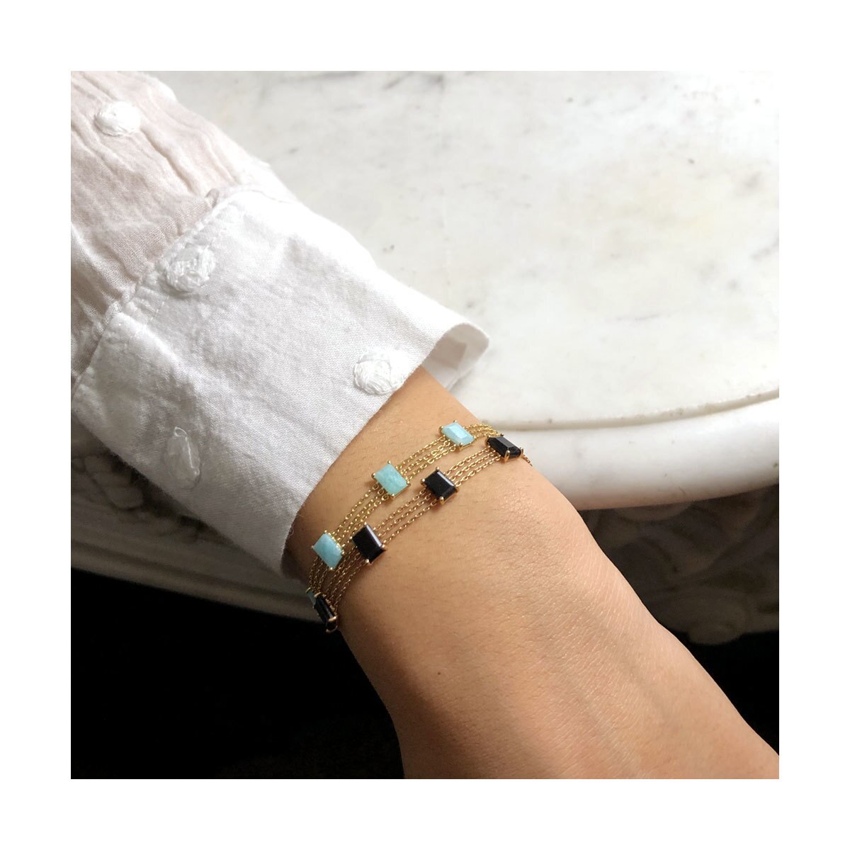 Bracelet 4 Baguettes Pierres Fines Naturelles non résinées : Agate Verte, Amazonite, Cornaline, Labradorite, Pierre de Lune Rainbow, Lapis Lazuli, Opale Rose, Onyx Noir, Grenat Motif : 4 Baguettes Pierre Fine Chaîne : 3 Rangs (Or 18K, 750‰) déclinée en Or Blanc, Or Jaune et Or Rose Longueur : réglable à 15 cm, 16 cm, 17 cm Fabrication Française Expédié sous 24h à 72h maximum (jours ouvrés) si disponible en stock, sous 30 jours si non disponible en stock. Bracelet 4 Baguettes – Bracelet Or – Bracelet Pierre Fine – Bracelet Femme Pierre Fine Baguette – Bracelet LAYONE Paris de la Collection Bambou. LAYONE Paris : la maison de joaillerie de la créatrice Morganne Bello